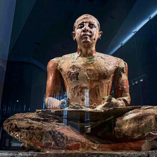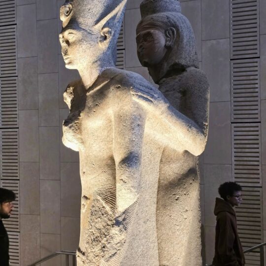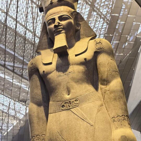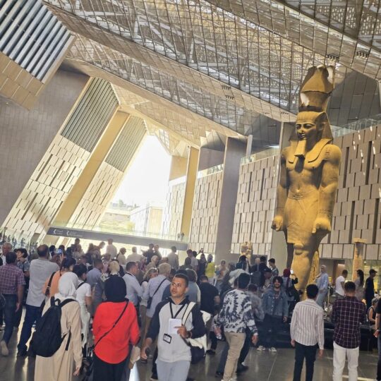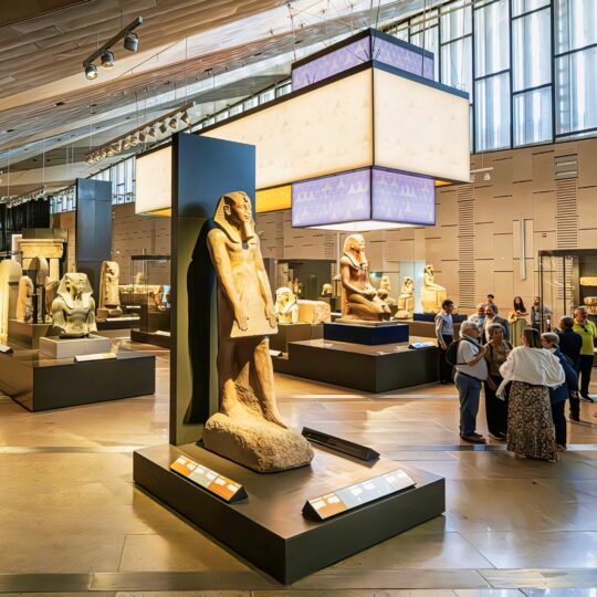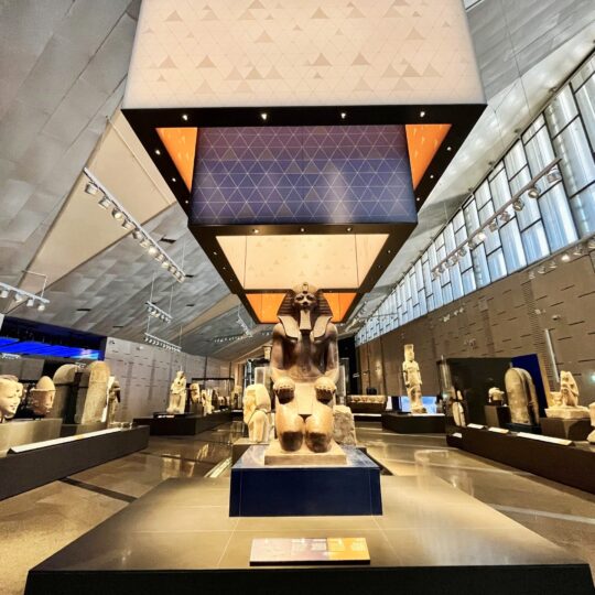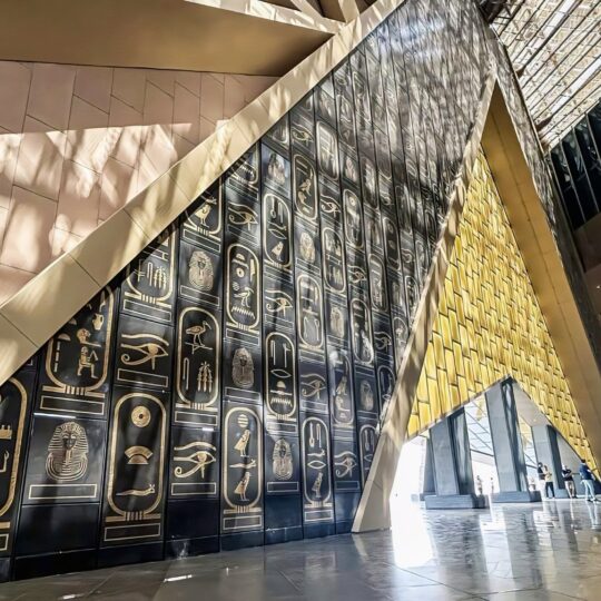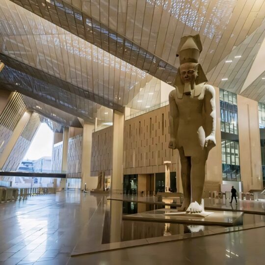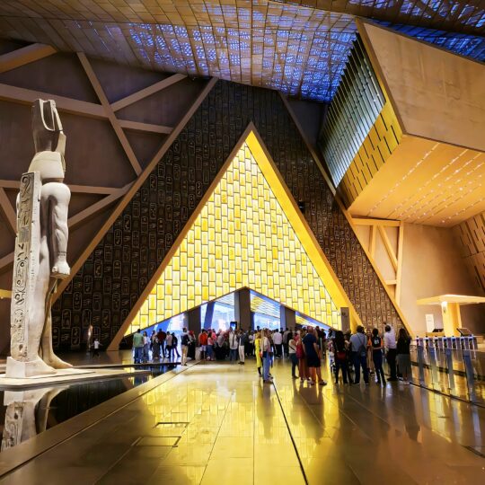 Upon arriving in the capital, you’ll be greeted by the main attraction of the day: the recently opened Grand Egyptian Museum (GEM), situated at the base of the Giza Plateau, adjacent to the pyramids.